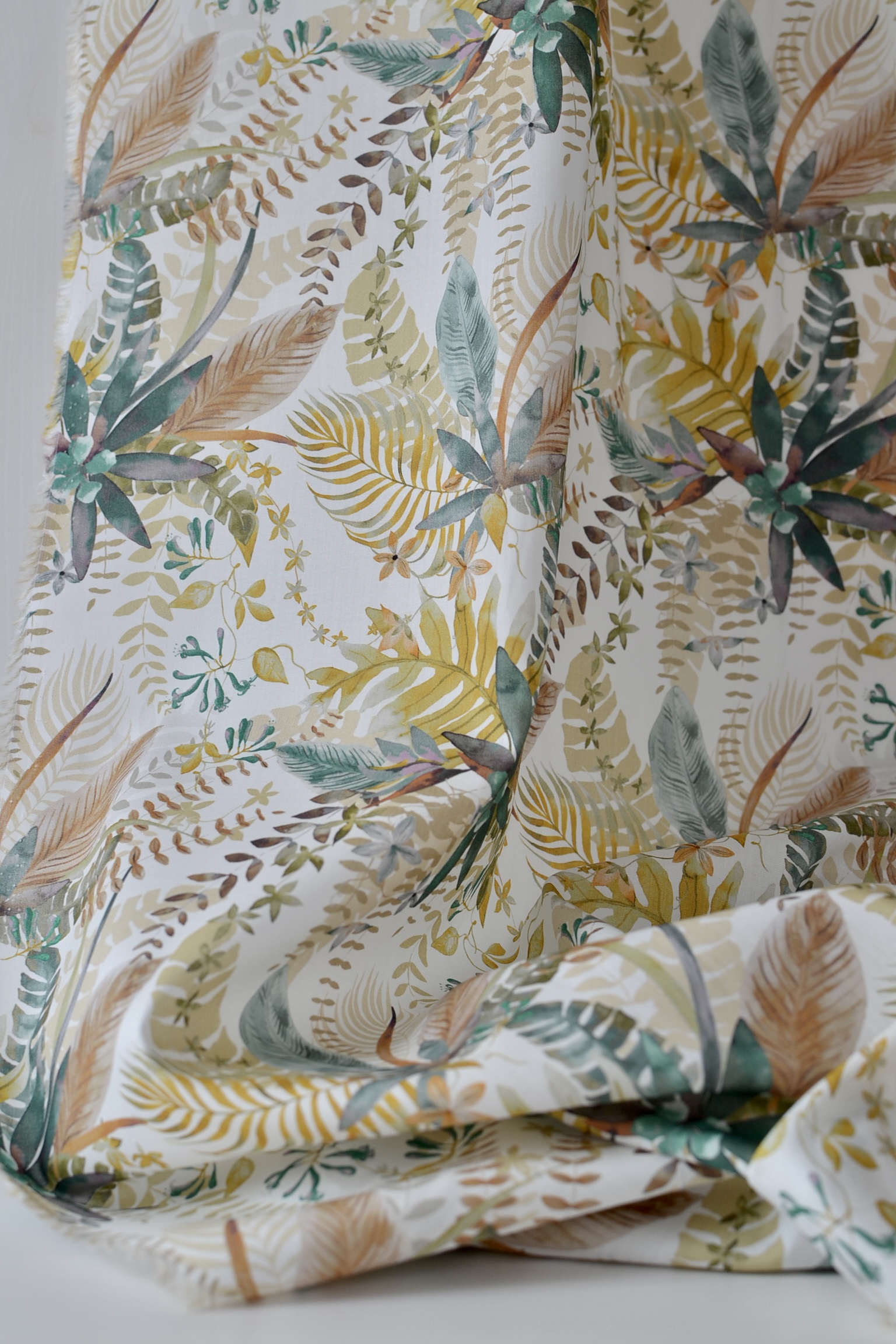Adeoye, das ist Urwald mal anders. Ein Gewirr aus Dschungelflora in den schönsten warmen Gelb-Braun-Grüntönen, handgemaltes Design auf milchweißem Grund.