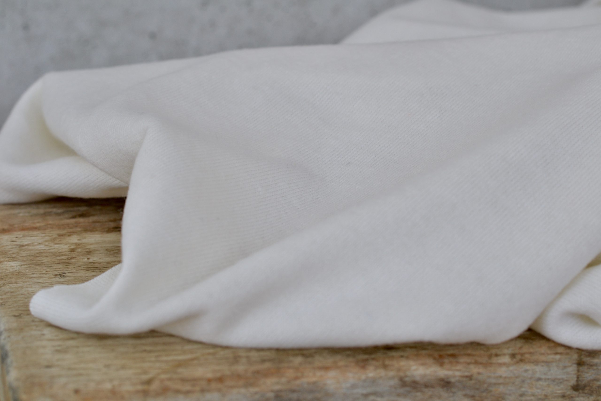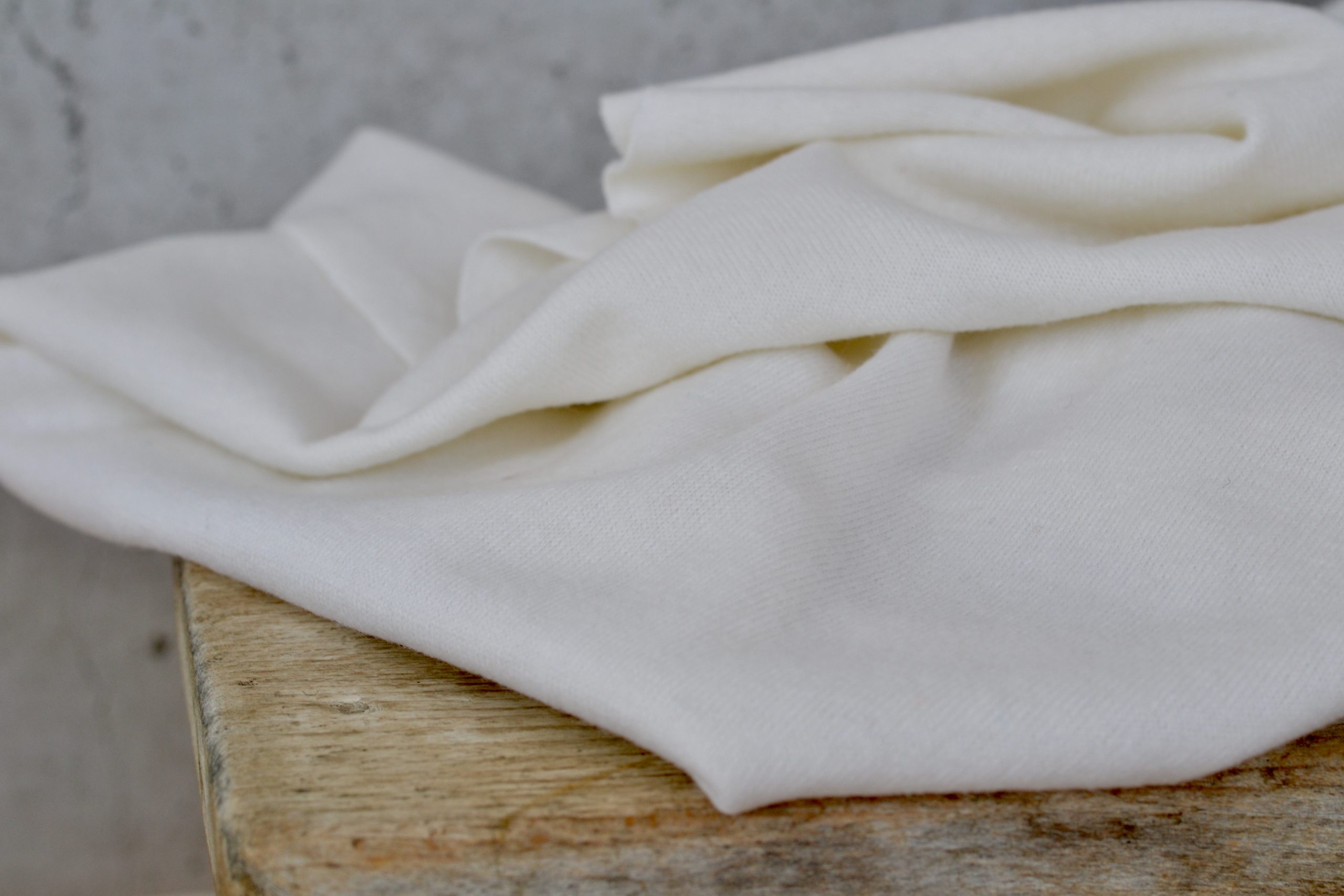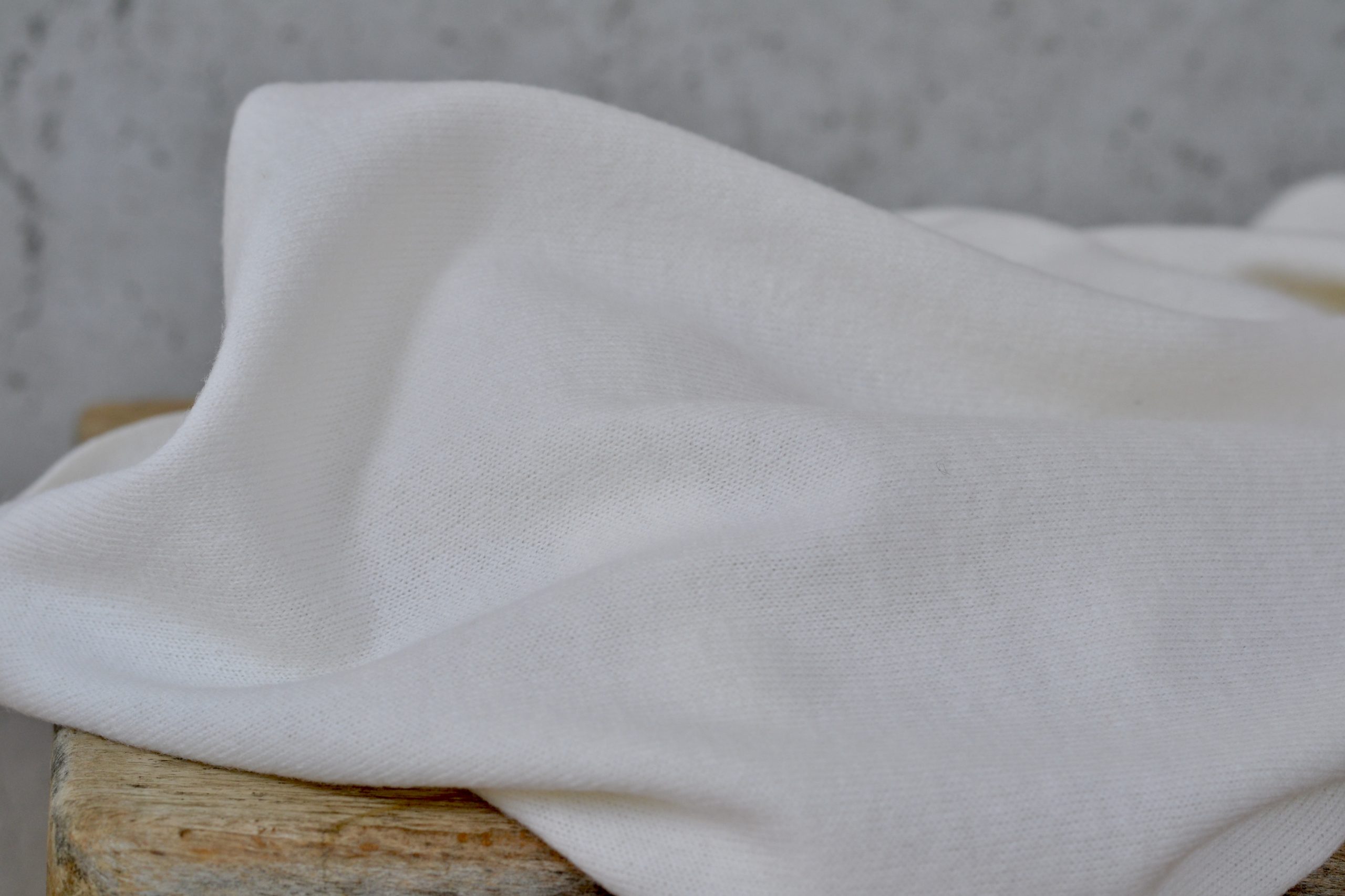 Ein traumhaft schöner Merino Strick in der Farbe off-white, einem weichen Weiß und nicht so hart wie Reinweiß. Der Stoff ist mulesingfrei und kommt aus Italien. Der Stoff ist herrlich weich, leicht und sehr geschmeidig, einfach eine traumhafte Qualität. Weicher geht es wirklich nicht! Der Stoff ist sehr angenehm auf der Haut, da er überhaupt nicht kratzt, außerdem ist Wolle atmungsaktiv und sie wärmt angenehm und man schwitzt nicht. Der Merino Strick ist der perfekte Stoff für das ganze Jahr.