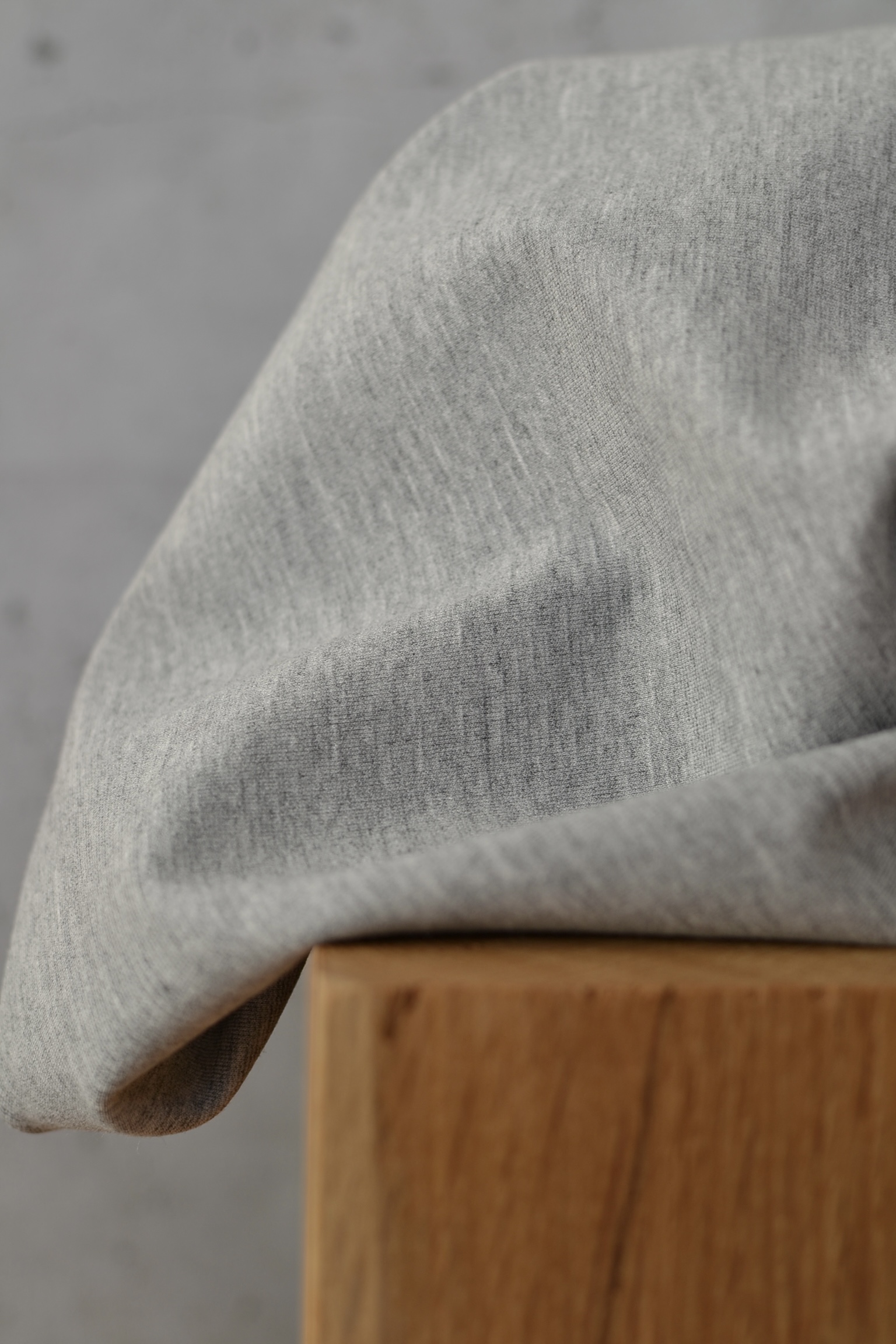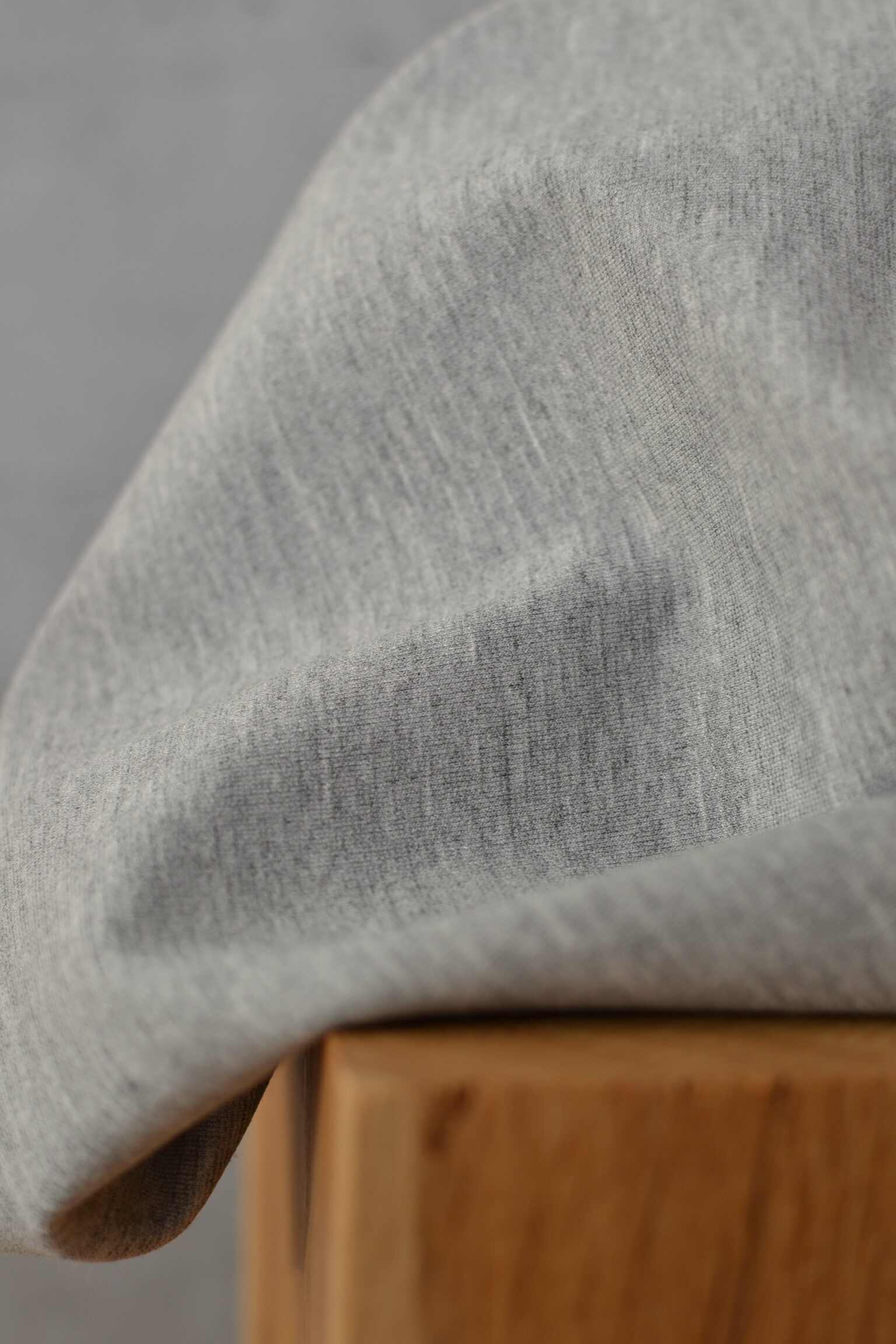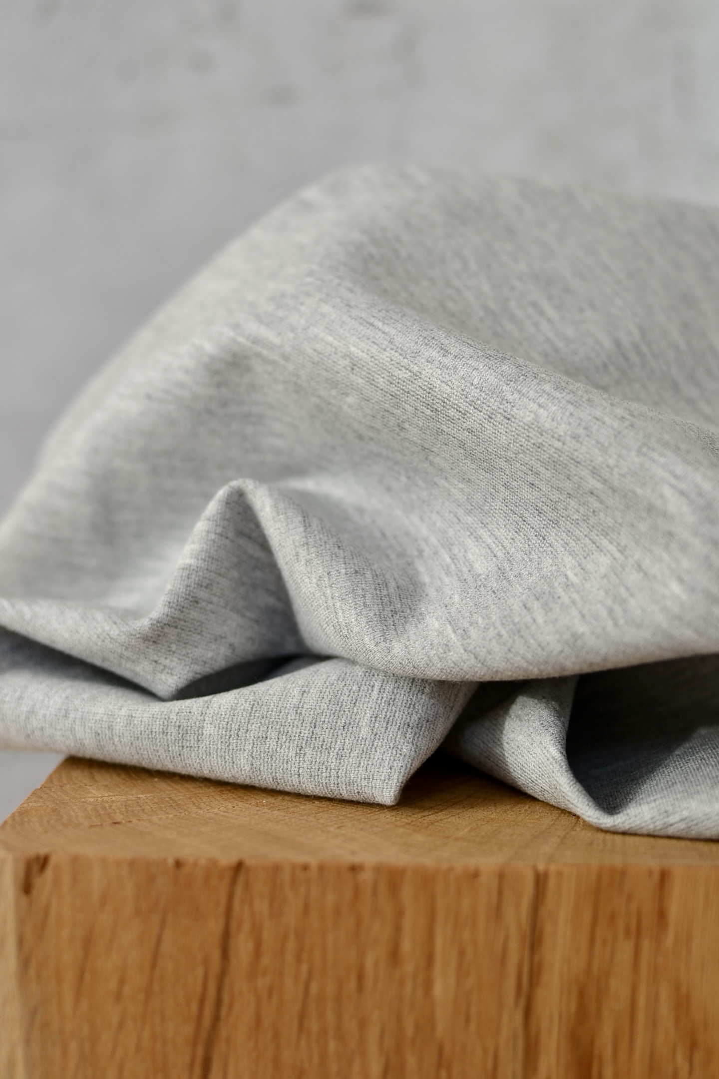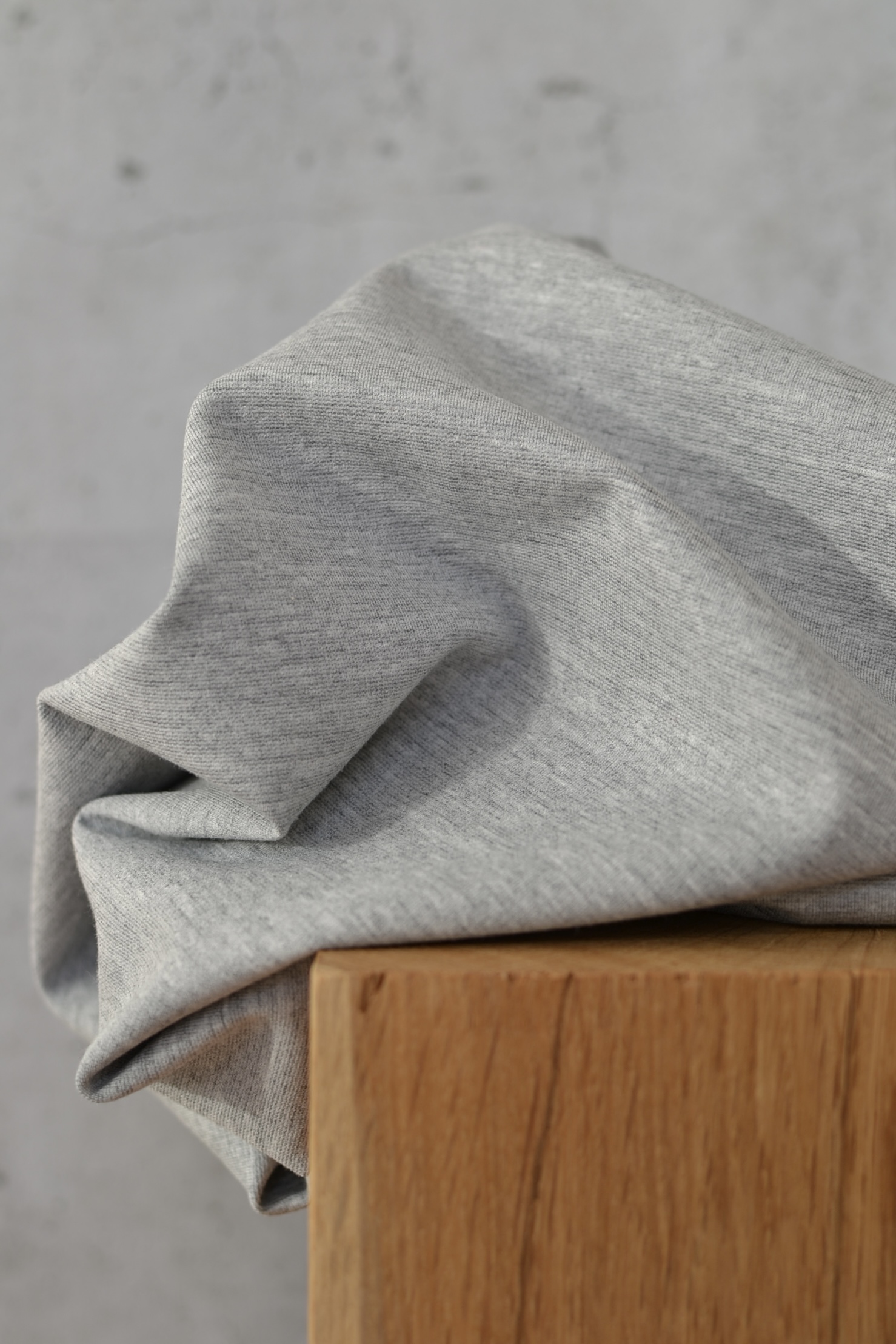 Ein toller gestrickter Jersey in einem schönen melierten Hellgrau. Punto Milano (oder auch Romanit Jersey) ist fester als herkömmlicher Jersey. Der Stoff ist ein doppelter Jersey und hat zwei rechte Seiten, er kann also beidseitig verarbeitet werden. Der Stoff hat eine gute Dehnbarkeit und etwas Stand und eine tolle glatte Oberfläche mit etwas Griff. Außerdem bleibt der Stoff gut in Form, leiert nicht und hat eine gute Rücksprungkraft.