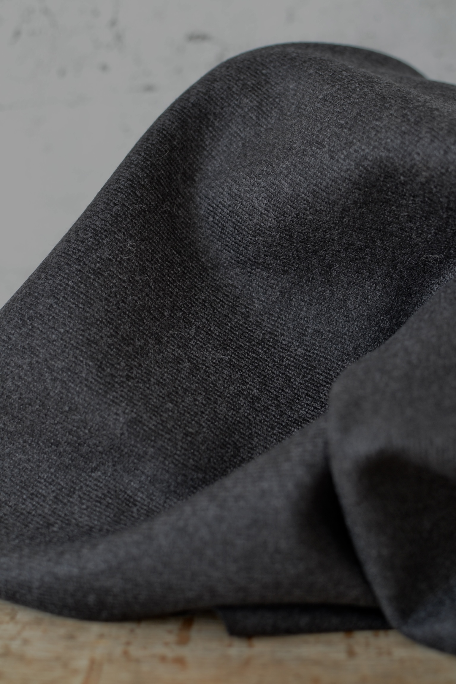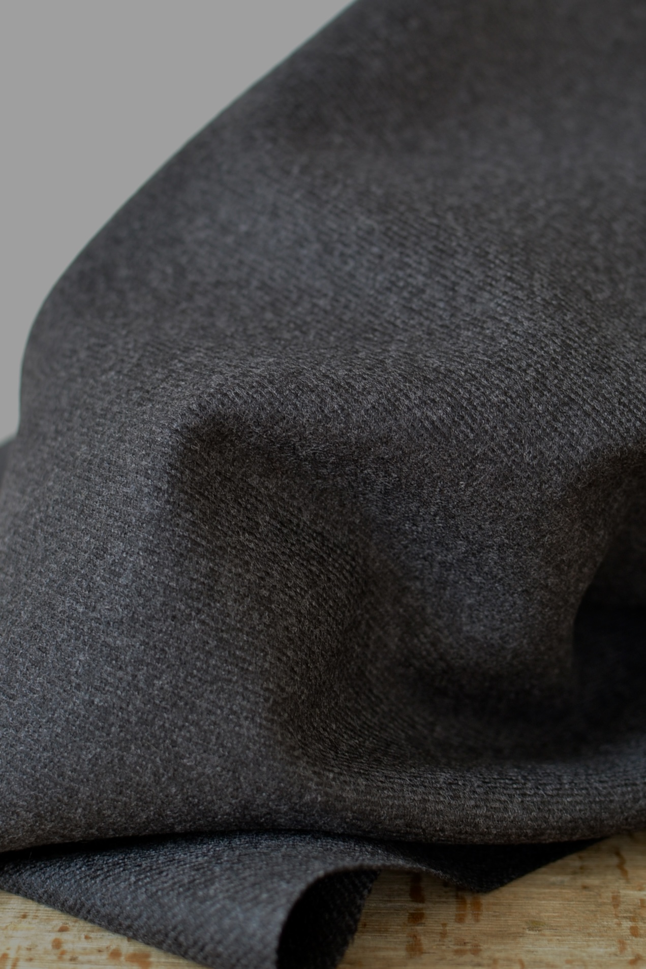 Weicher, leicht flanelliger Schurwollstoff in einem edlen, dunklen Anthrazit – Schurwolle Gianni ist ein Designerüberhang aus einer renommierten italienischen Weberei. Ursprünglich für ein Premium-Fashionlabel gefertigt, wird er jetzt nicht mehr gebraucht.